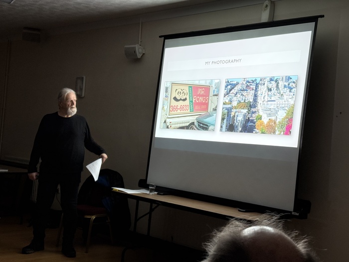 After a break Andy then showed us his style of Street Photography . Working through themes , small panels of photos were shown , including interesting people, street murals and posters, funny signs, transportation, shopping, mobile phones , lunchtimes, family outings and much more . It was good to see many different emotions visualised, expressions to make you smile . Andy emphasised it is easy to have a go at this genre without having to invest in special equipment . A mobile phone is a great beginning .